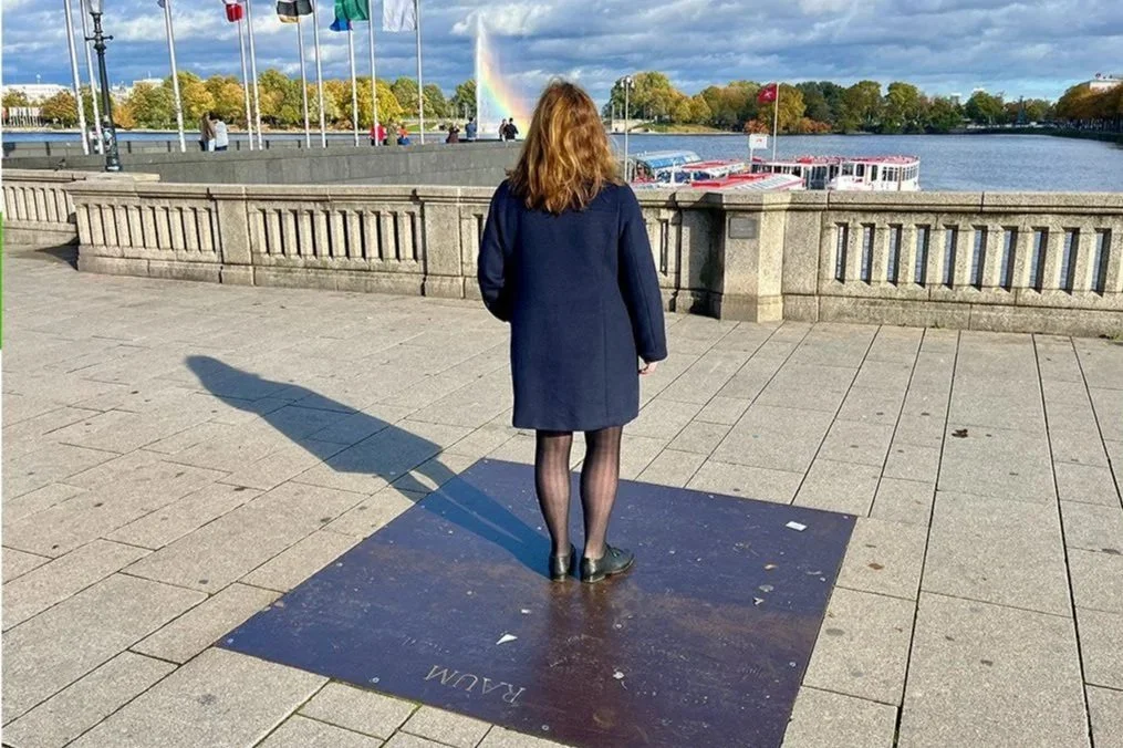 Nein, das ist nicht die Kunstflâneurin über dem Nebelmeer, sondern auf einem der „Sieben Orte für Hamburg“ von Franz Erhard Walther (*1939). Das Kunstwerk besteht aus quadratischen Stahlplatten mit einem am menschlichen Körper orientierten Seitenmaß von 1,80 Meter, die bündig in den Boden eingelassen sind. Auf den sieben Platten steht jeweils ein Begriff (Ort, Richtung*, Koerper, Innen Aussen, Bewegung, Raum und Zeit) in Großbuchstaben eingraviert, die auf einem fast kreisförmigen Rundgang in der Hamburger Innenstadt verteilt sind. Zum Kunstflânieren zu allen Orten wird eine Stunde benötigt und führt von der Kunsthalle über den Deichtorplatz, den Jungfernstieg bis nahe an die Lombardsbrücke.